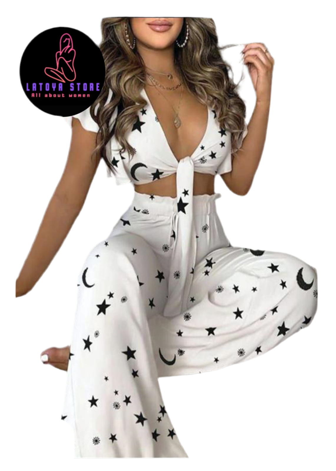 بيچامة مكونة من توب بتصميم مميز يُربط عند الصدر لإطلالة أنثوية جذابة، مع بنطلون واسع مزين بنقشة النجوم الساحرة. مثالية للراحة مع لمسة من الجاذبية