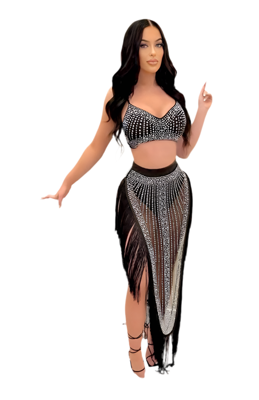 بدلة رقص من قطعتين شيبة شيفون وتوب مصممة بعناية مع لمسة من الاسترس لتضفى لمعة ولمسة من الجمال على الإطلالة